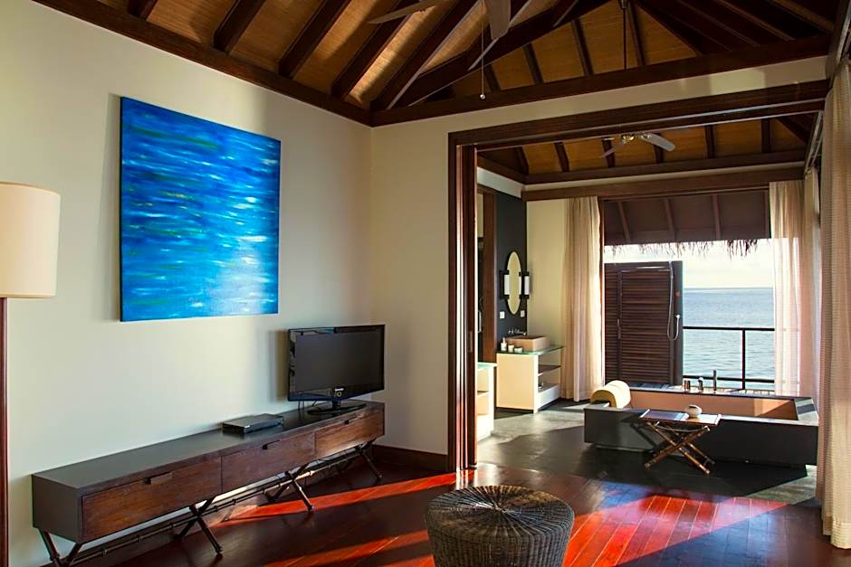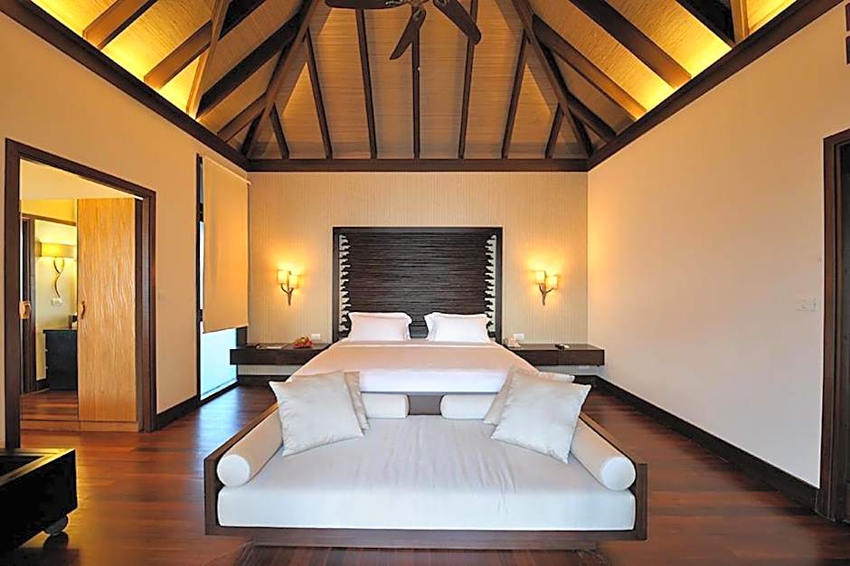 A spacious villa featuring a private courtyard, a dressing room and a luxurious bathroom with 2 showers (indoor & outdoor) and a bathtub which oversees the ocean. It also has a private sundeck and a dining area.